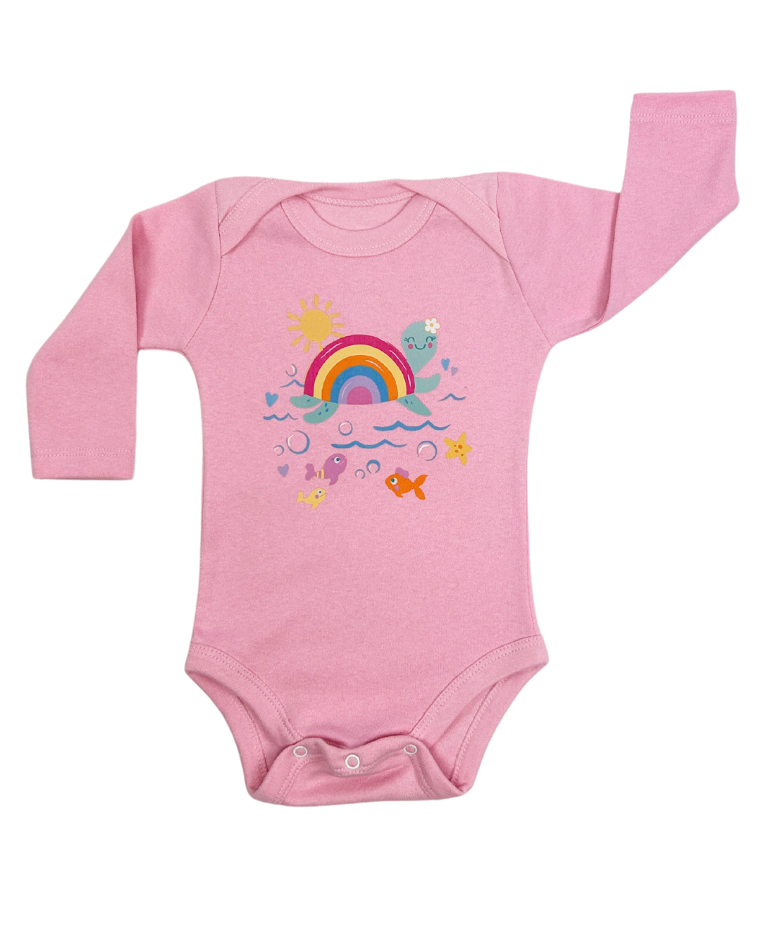 Este diseño encantador muestra una tortuguita feliz navegando entre arcoíris, peces y estrellas de mar. Perfecto para bebés que iluminan todo a su paso.