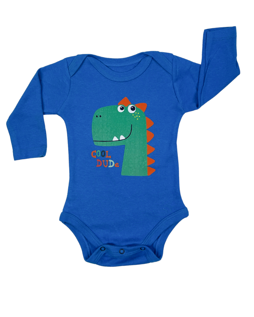 Este body azul con un simpático dinosaurio y la frase “Cool Dude” está hecho para los peques que ya tienen toda la onda desde la cuna 💥🦕