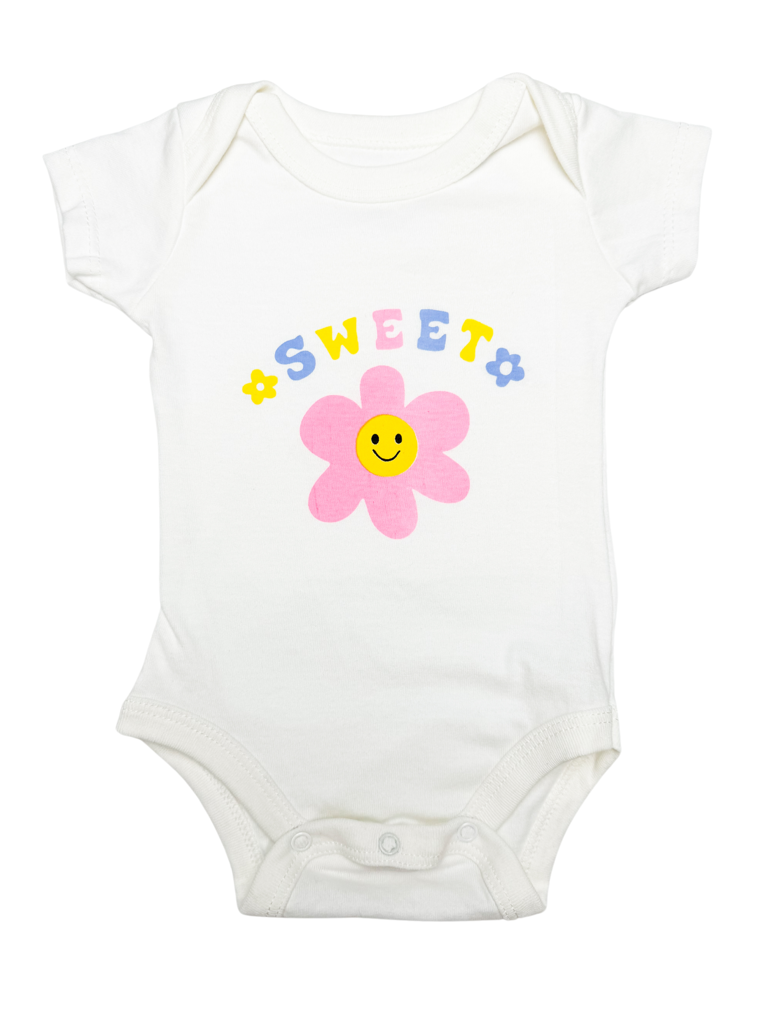 Dulzura y estilo en un solo body 🌸. Este diseño presenta una encantadora flor rosa con una carita sonriente acompañada de la palabra «SWEET» en colores vibrantes, ideal para iluminar cualquier día.