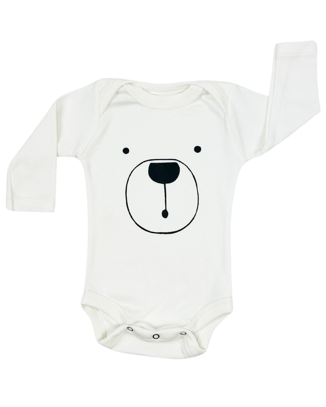 Un clásico moderno que enamora: este body blanco con la carita de un osito en estilo minimalista es ideal para quienes aman la simpleza con un toque de ternura.
