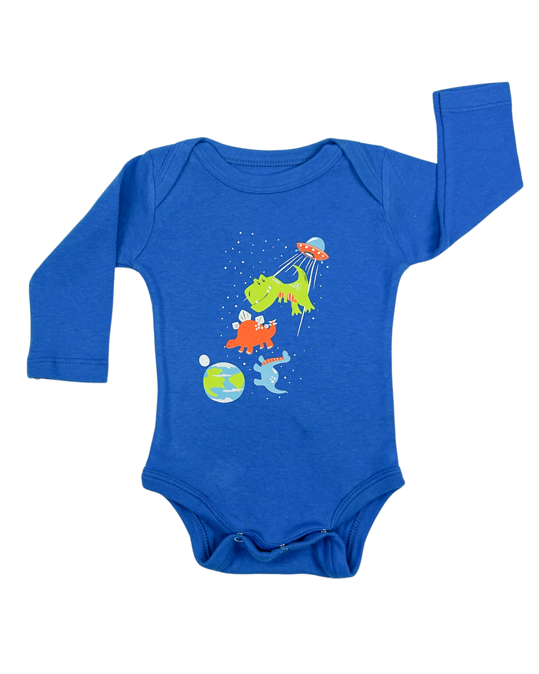 ¡Cuando los dinosaurios se encuentran con los extraterrestres, nace esta maravilla! Este body azul con ilustración espacial tiene todo para convertirse en el favorito del universo 👽🦖