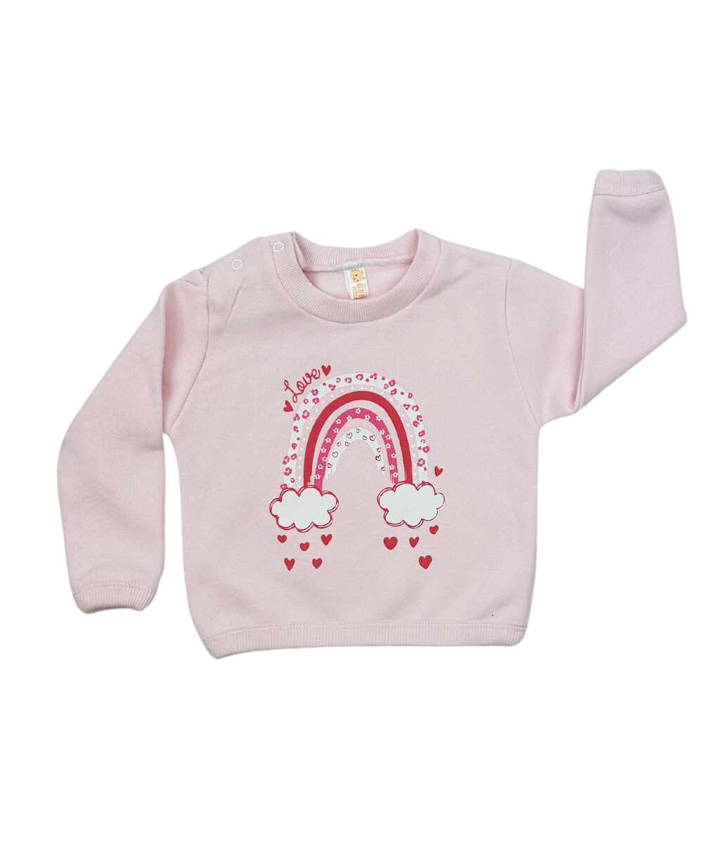 Un toque de ternura para los días frescos: buzo de frisa rosa con arcoíris en tonos rosados y corazones. Dulce, suave y lleno de amor. 🌈💗
