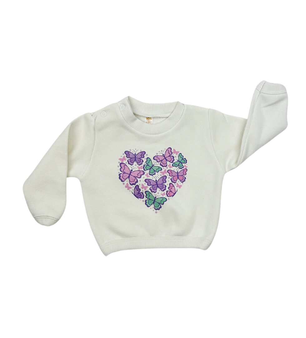 Un diseño lleno de ternura: mariposas en tonos lilas, rosados y verdes formando un corazón. Este buzo de frisa liviana es ideal para acompañar sus aventuras en días frescos, con el toque justo de color y dulzura. ¡Cómodo, suave y fácil de combinar!
