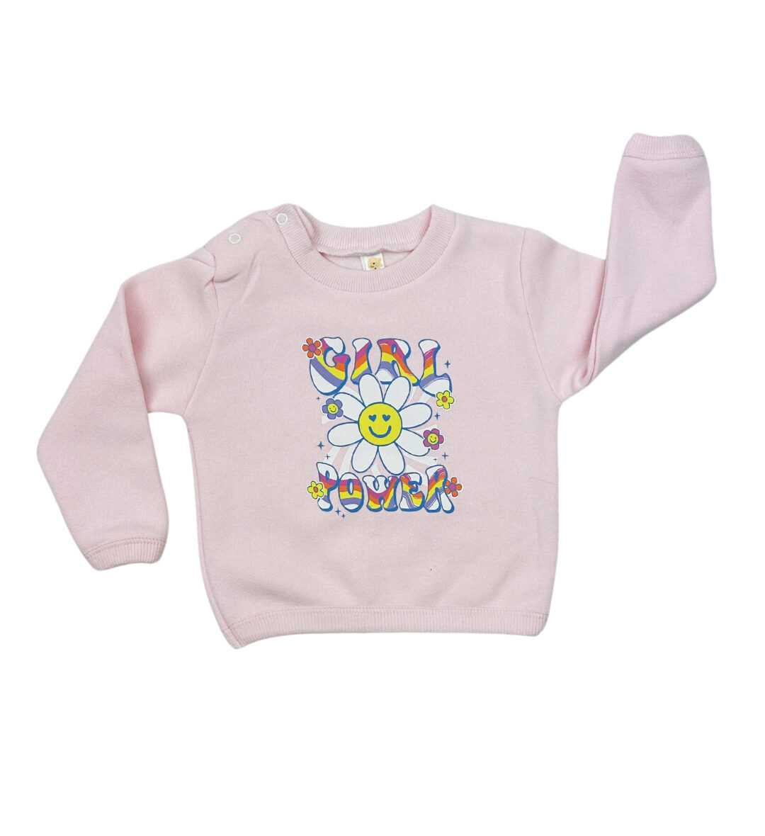 ¡Porque las chicas tienen el poder! Este buzo rosa pastel con estampa de flor sonriente y letras coloridas es una explosión de alegría. Confeccionado en frisa súper suave, ideal para días frescos llenos de color y energía.