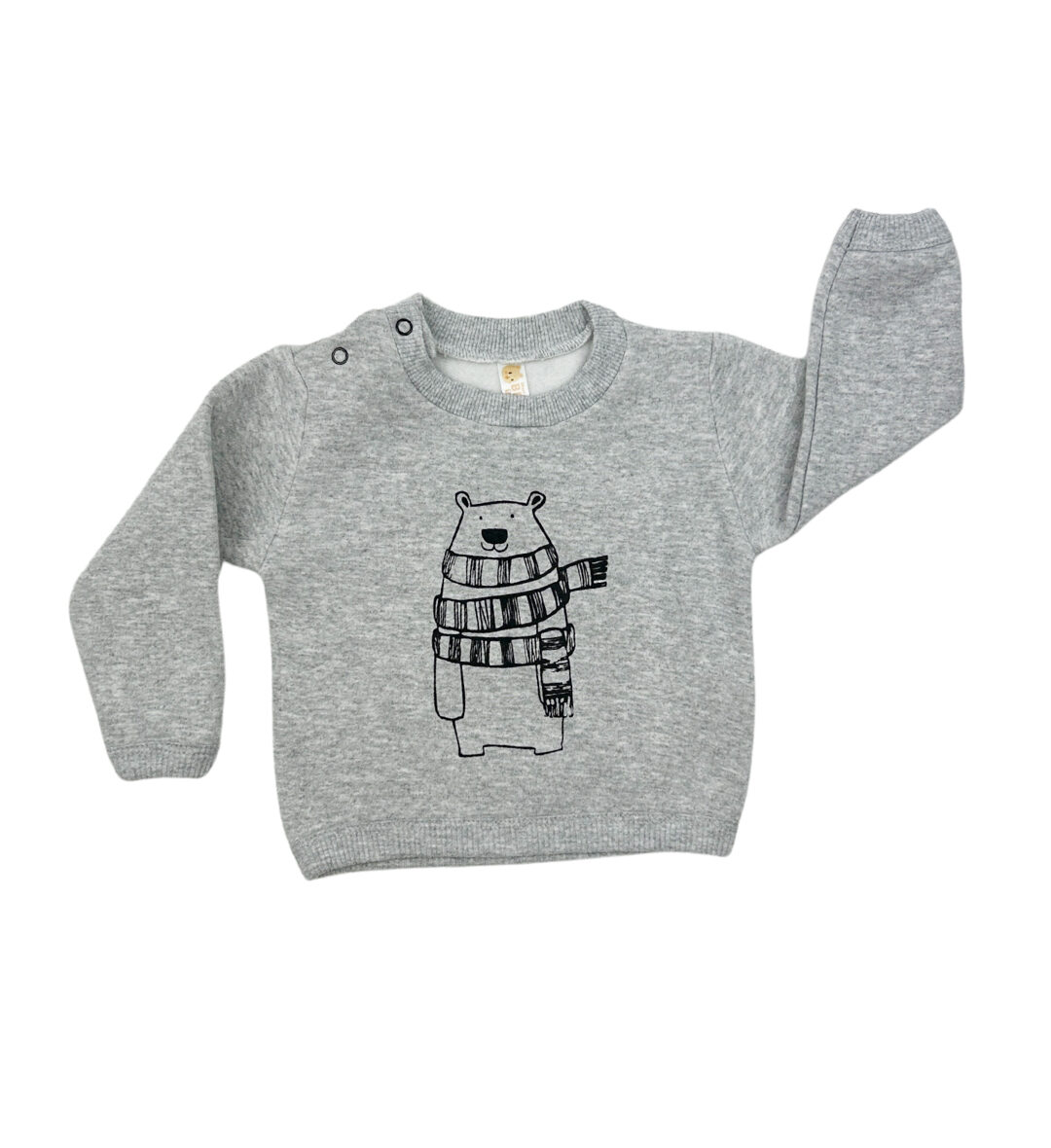 Este buzo gris de frisa con estampa de osito y bufanda es puro amor invernal. Confeccionado en algodón suavecito, ideal para mantener a tu peque calentito sin perder el estilo. Tiene dos prácticos botones en el hombro para vestir con facilidad y un diseño tierno que acompaña cualquier aventura.