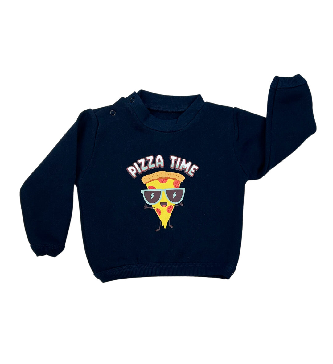 ¡Hora de la pizza! Este buzo azul marino trae una estampa divertida y colorida con una porción de pizza con anteojos, lista para robarse todas las miradas. Confeccionado en frisa suave y con 2 botones en el hombro para vestir con comodidad. Ideal para peques con mucha onda.