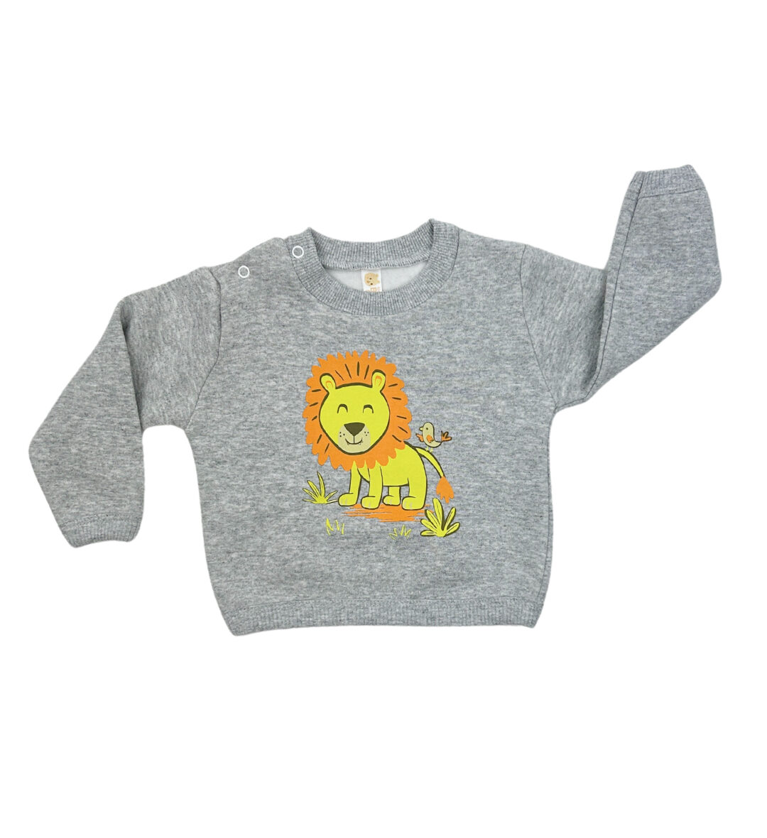 ¡Rugidito de amor! 🦁💛 Este buzo gris con estampa de león y pajarito es pura ternura y aventura. Ideal para acompañar a tu peque en los días más frescos con mucho estilo.