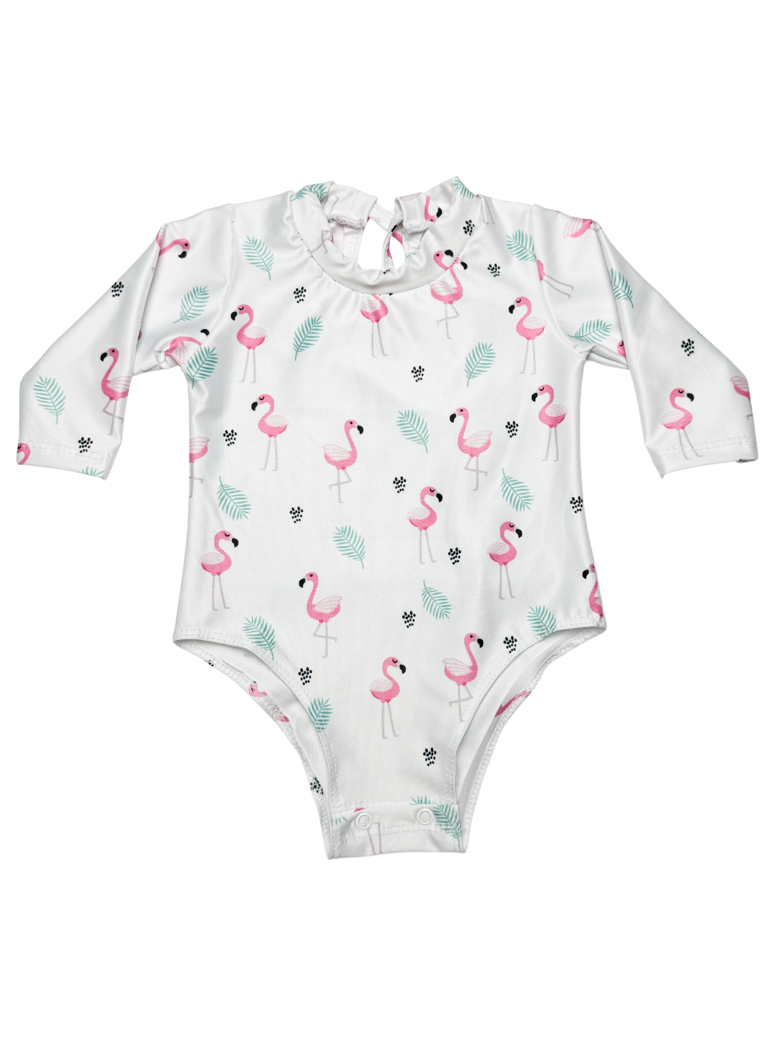Esta encantadora Malla de manga larga está diseñada con un alegre estampado de flamencos rosados y hojas tropicales, perfecto para los días de sol. Confeccionado en tela con protección UV, garantiza el cuidado de la delicada piel de tu bebé mientras juega al aire libre.