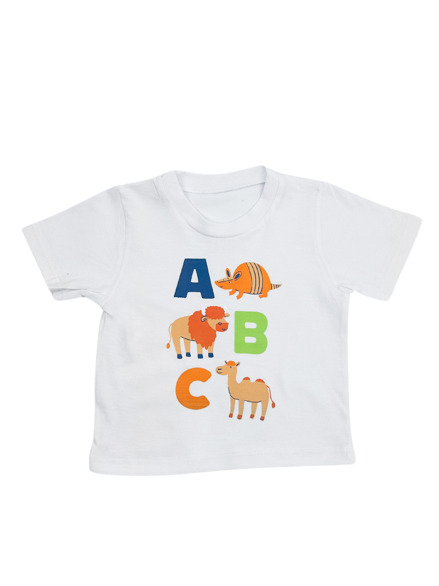 🔠 ¡Aprender con animales es más divertido! 🦁🐫 Esta remera de algodón suave con el diseño de «A, B, C» junto a un armadillo, un búfalo y un camello es ideal para los pequeños curiosos que aman los animales y el aprendizaje.
