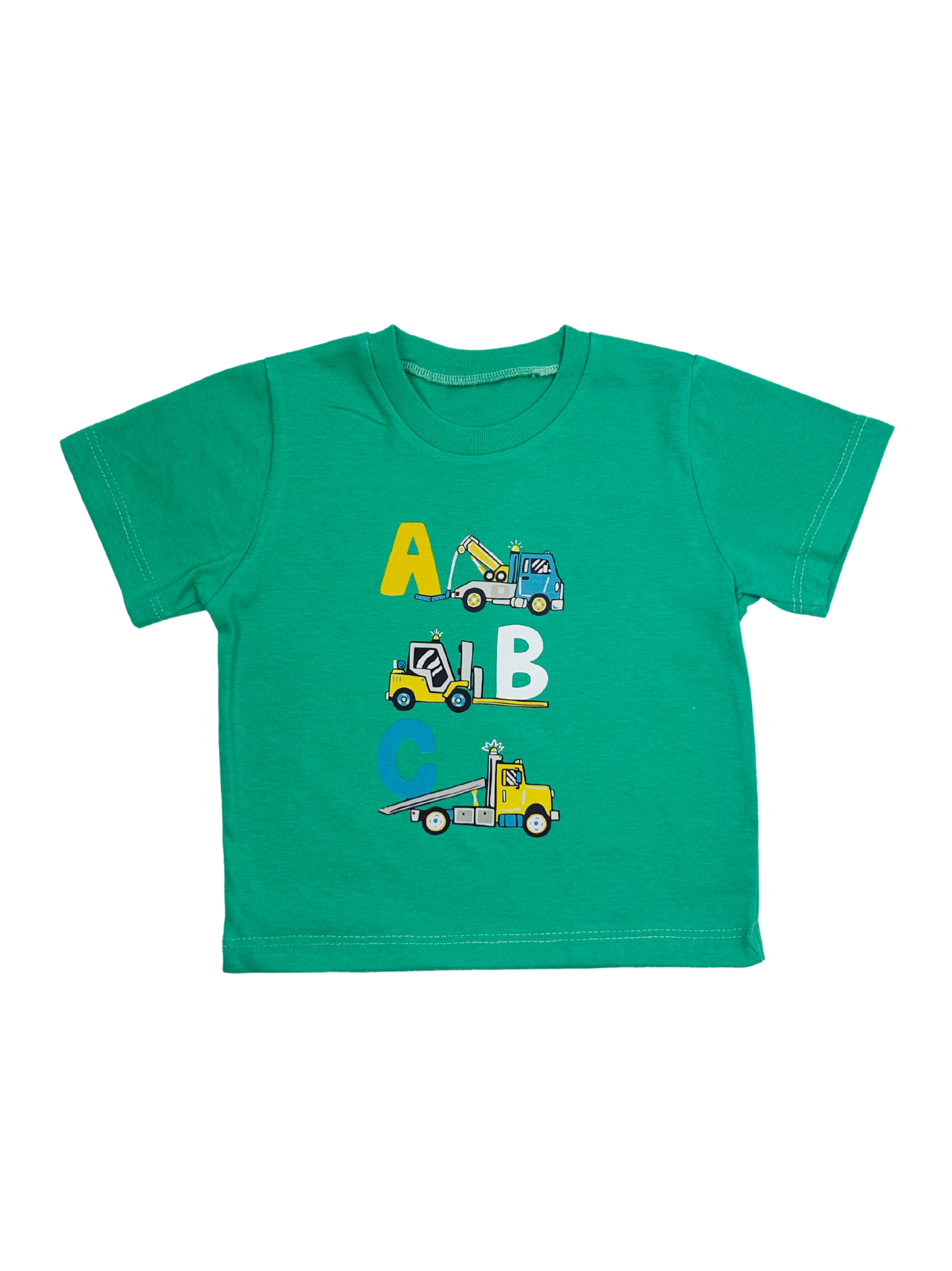 🚛 ¡Aprender nunca fue tan divertido! 🔤✨ Esta remera de algodón suave con las letras A, B y C junto a vehículos de construcción es ideal para los pequeños fanáticos de los camiones y el aprendizaje.