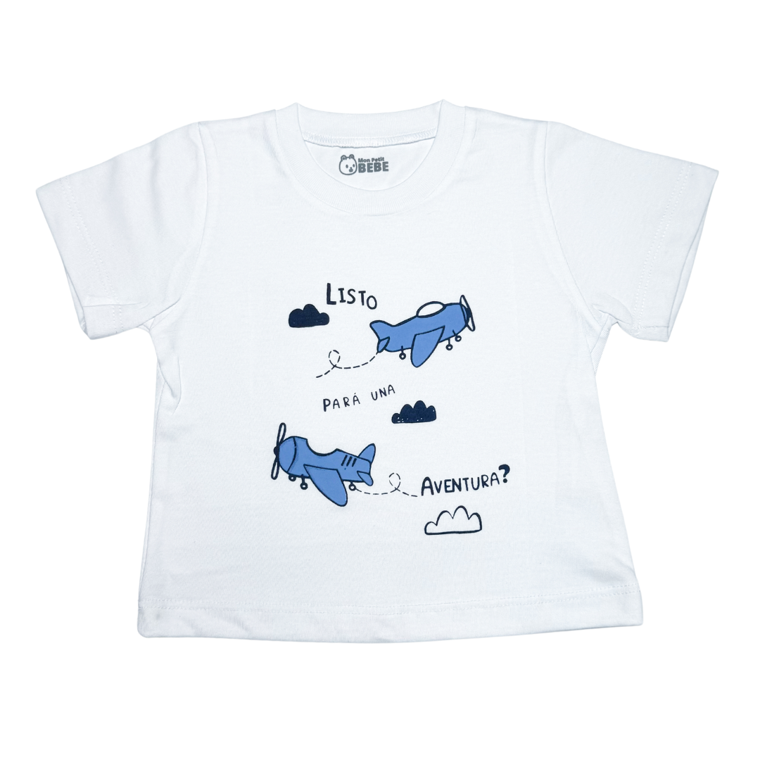 ¡La aventura está en el aire! ✈️ Con un diseño encantador de avioncitos y el mensaje «¿Listo para una aventura?», esta remera es perfecta para los pequeños exploradores que sueñan con volar alto. Confeccionada en jersey suave y cómodo, es ideal para acompañar a tu bebé en cada día de diversión y descubrimiento.