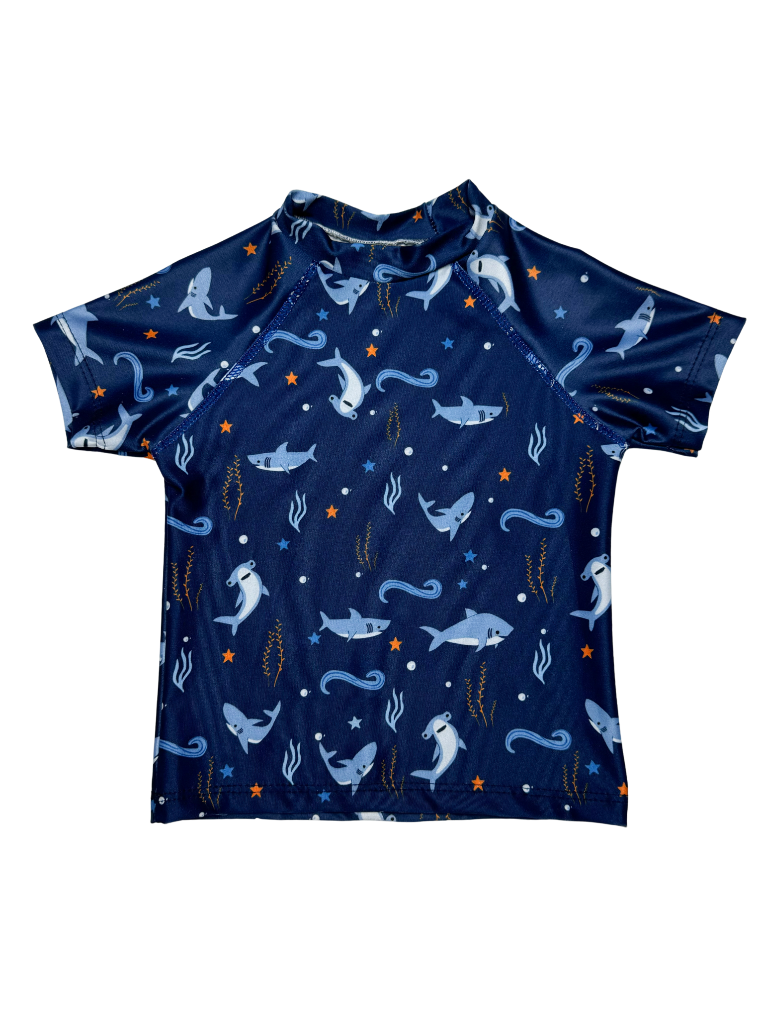 Esta remera de baño de manga corta combina estilo y protección para los días más soleados. Con un estampado marino lleno de tiburones y estrellas, es perfecta para los pequeños amantes del agua.