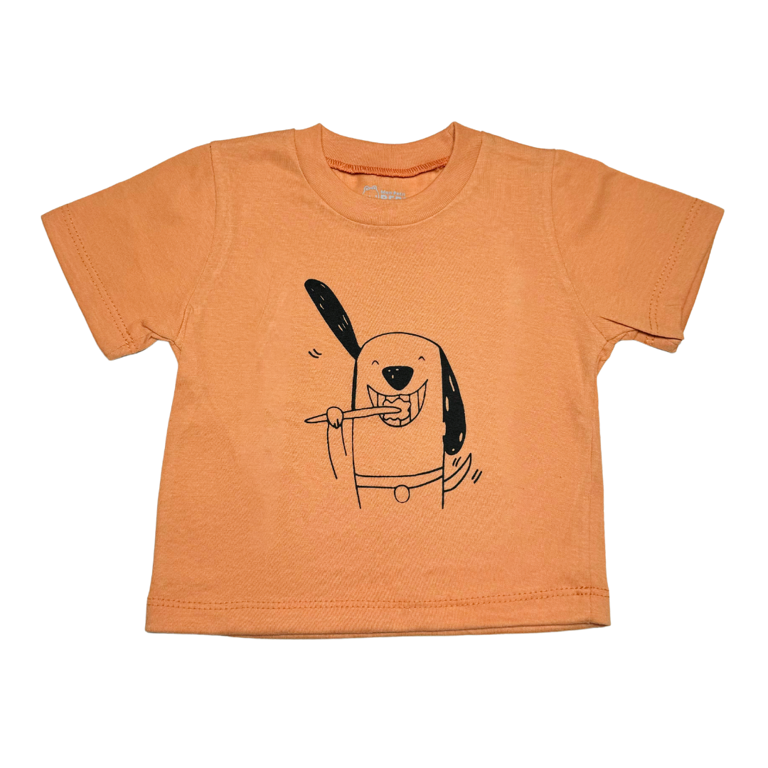 ¡Hora de sonreír con estilo! 🐶 Esta remera de color cálido presenta un simpático diseño de perrito que seguro encantará a los más pequeños. Confeccionada en jersey suave, es perfecta para que tu bebé juegue, explore y se divierta con total comodidad. Un toque de alegría y originalidad para su día a día.