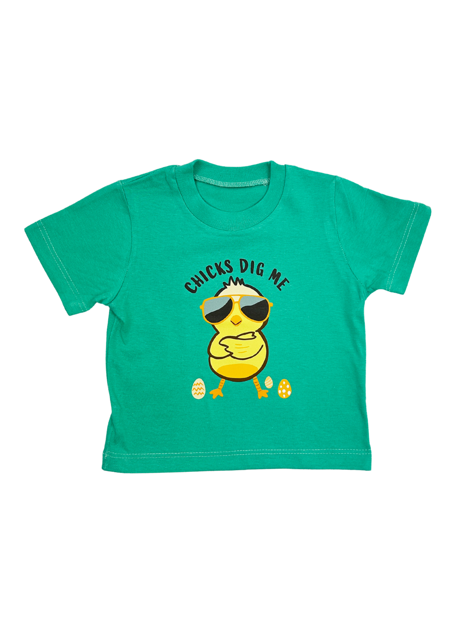 🐥 ¡El pollito más cool llegó a tu ropero! 🕶️🔥 Esta remera de algodón suave con un diseño de pollito con gafas de sol y la frase «Chicks dig me» es perfecta para los peques con mucha onda.