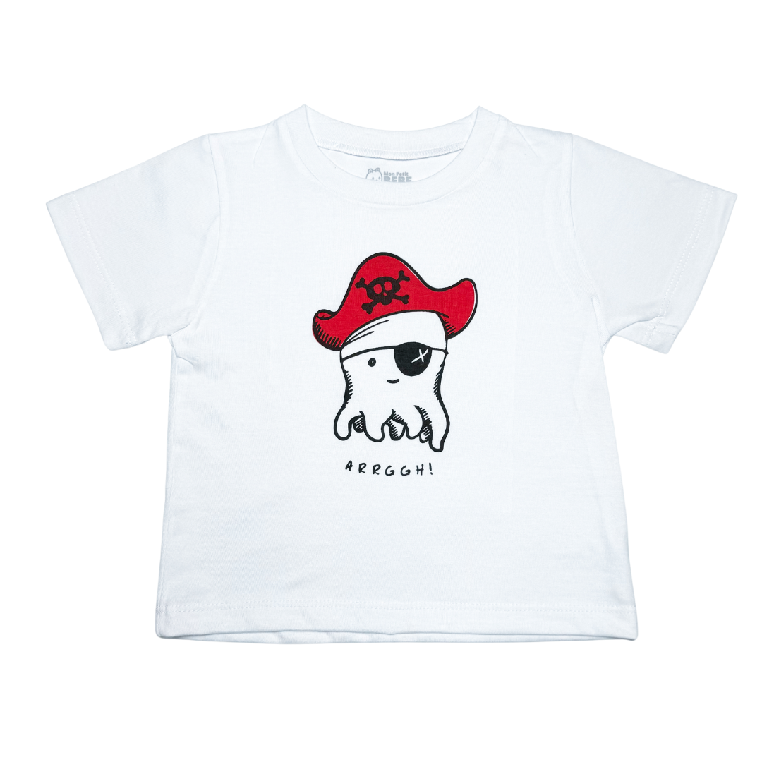 ¡Arrrggh! 🏴☠️ Para los pequeños aventureros del mar, esta remera presenta un simpático pulpo vestido de pirata, listo para navegar los mares de la imaginación. Con un estampado divertido y colores vibrantes, es perfecta para darle un toque único y juguetón al look de tu bebé. Confeccionada en jersey suave, brinda total comodidad para sus días de exploración.